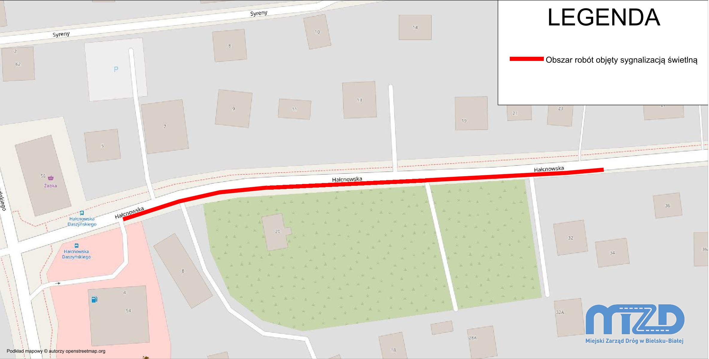 Informujemy, że od 6 października przez okres około 3 miesięcy wprowadzona zostanie tymczasowa organizacja ruchu na ul. Hałcnowskiej na odcinku od wyjazdu ze stacji benzynowej do posesji nr 32. Zmiana polegać będzie na zawężeniu jezdni do jednego pasa ruchu, a ruch sterowany będzie za pomocą sygnalizacji świetlnej. Niniejsze utrudnienia komunikacyjne prowadzone są przez inwestora prywatnego i związane są z budową zjazdu do planowanego pawilonu handlowego.