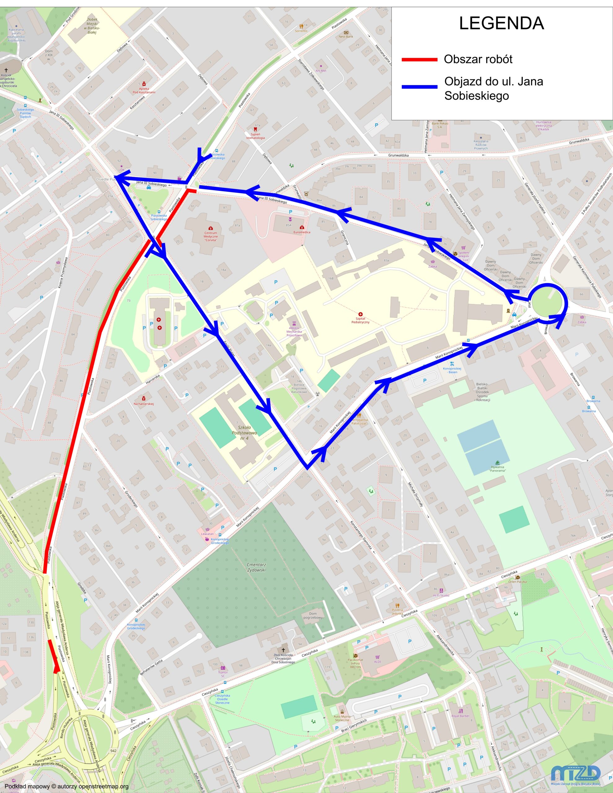 Odwrócony zostanie ruch jednokierunkowy na ul. Emilii Plater – na odcinku od ul. Piastowskiej do rejonu posesji nr 18 obowiązywać będzie kierunek ruchu od ul. Piastowskiej do ul. Marii Konopnickiej) Zablokowany będzie wjazd z ul. Piastowskiej w ul. Jana Sobieskiego w kierunku Szpitala Pediatrycznego. Objazd poprowadzony zostanie ulicami: Jana Sobieskiego › Emilii Plater › Marii Konopnickiej (zgodnie z załączoną grafiką). Z ruchu wyłączony zostanie łącznik prowadzący relację z ul. Piastowskiej do ul. Cieszyńskiej (w kierunku Wapienicy). Dla tego kierunku ruch będzie prowadzony przez rondo „Hulanka”.