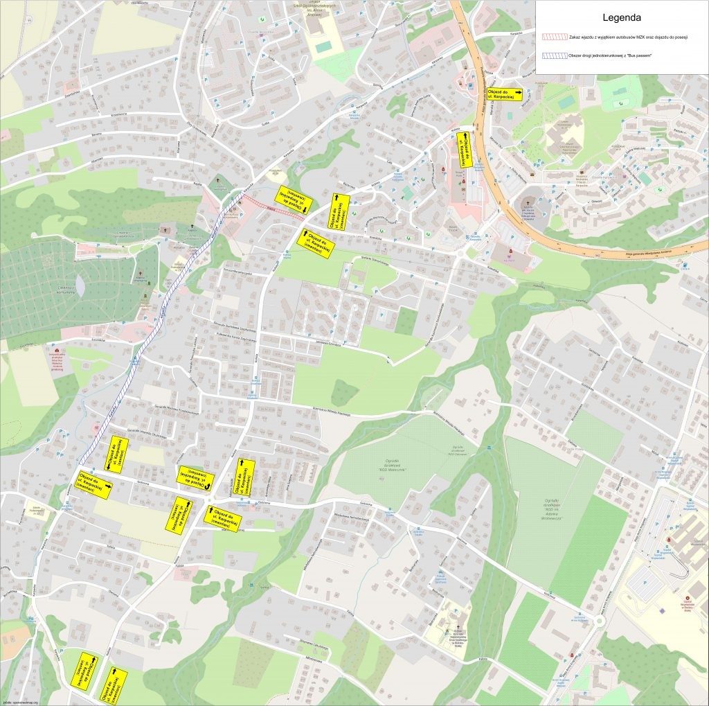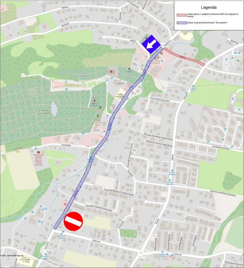 Ruch jednokierunkowy na ul. Karpackiej /od ul. Niwnej do ul. Gościnnej/ z wyznaczonymi dwoma pasami. Prawy pas ruchu przeznaczony będzie wyłącznie dla autobusów.